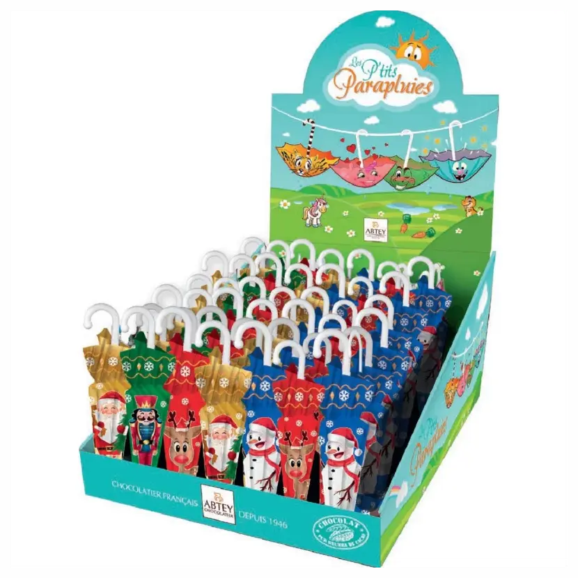 Vneste do Vánoc trochu radosti a sladkosti s originálními mléčnými čokoládovými deštníky od francouzské čokoládovny Abtey! Každý deštník (12 g) je vyroben z kvalitní jemné mléčné čokolády a zabalen do barevného obalu s veselými vánočními motivy – najdete zde sněhuláky, soby, Santa Clause i další postavičky. Ideální jako sladká pozornost, adventní překvapení nebo dekorace k vánočnímu stromečku.