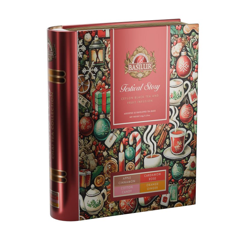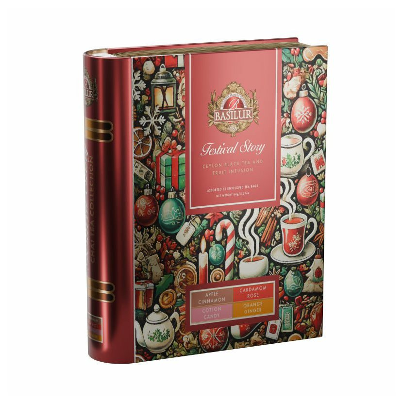 Vánoční dárková kniha porcovaných černých čajů s příchutí růže a kardamomu, pomeranče se zázvorem a cukrové vaty s dřišťálem a ovocného čaje s jablkem a skořicí.
