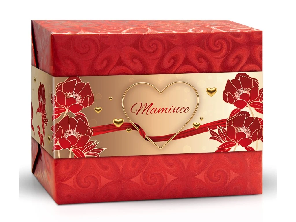 Krabička v krásném červeno-zlatém designu s jemnými květinovými motivy a srdcem působí velmi slavnostně a zároveň osobně. Uvnitř se ukrývá výběr lahodných čokoládových pralinek, které potěší každého milovníka sladkého.