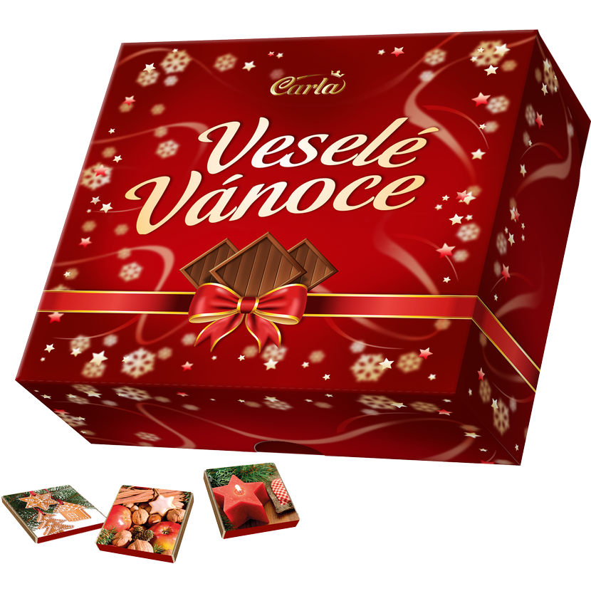 Dopřejte sobě i svým blízkým tradiční chuť jemné mléčné čokolády Carla v elegantním vánočním balení. Tato dárková krabice obsahuje 1 kg lahodných neapolitánek – malých čokoládek (cca 200 ks), každá zabalená do obalu s vánočním motivem.