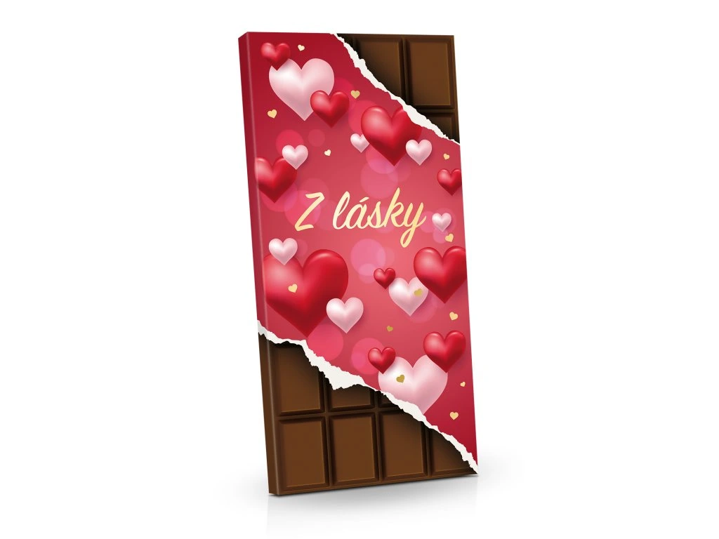 Lahodná hořká čokoláda. Plná srdíček s textem Z lásky. Darujte partnerovi jen tak z lásky nebo jako dárek k Valentýnu