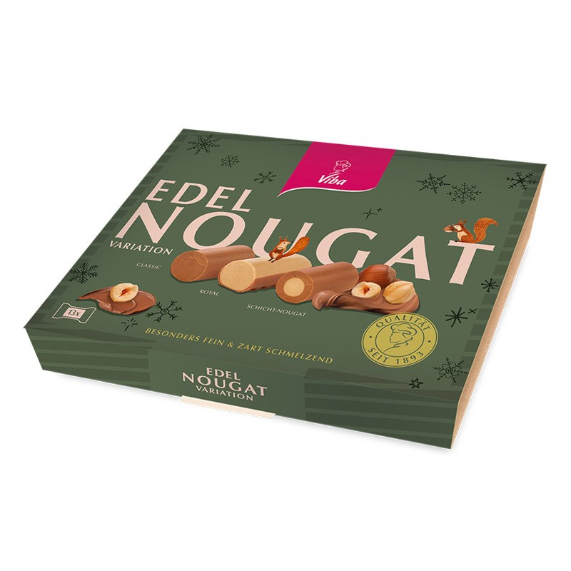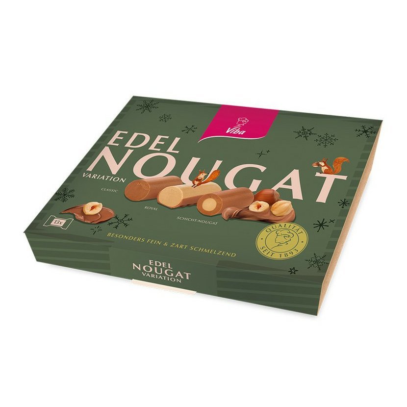 Hledáte vánoční dárek pro milovníka nugátu? Viba pro letošní rok přináší vánoční nugátovou bonboniéru, ve které najdete směs oříškového nugátu, světlého oříškového nugátu s 10% mléčné čokolády a světlého lísko oříškového nugátu s 11 % krokantu a 10 % mléčné čokolády. Nugátový výběr - 13 kusů Viba Nougat Mini v různých variantách. Obdarovaný si smlsne na 5x Viba Nougat Classic – originál od roku 1920; 4x Viba Royal Nougat – světlý oříškový nugát s čokoládovým základem; 4x Viba Brittle Nougat – duet světlého nugátu a krokantu.