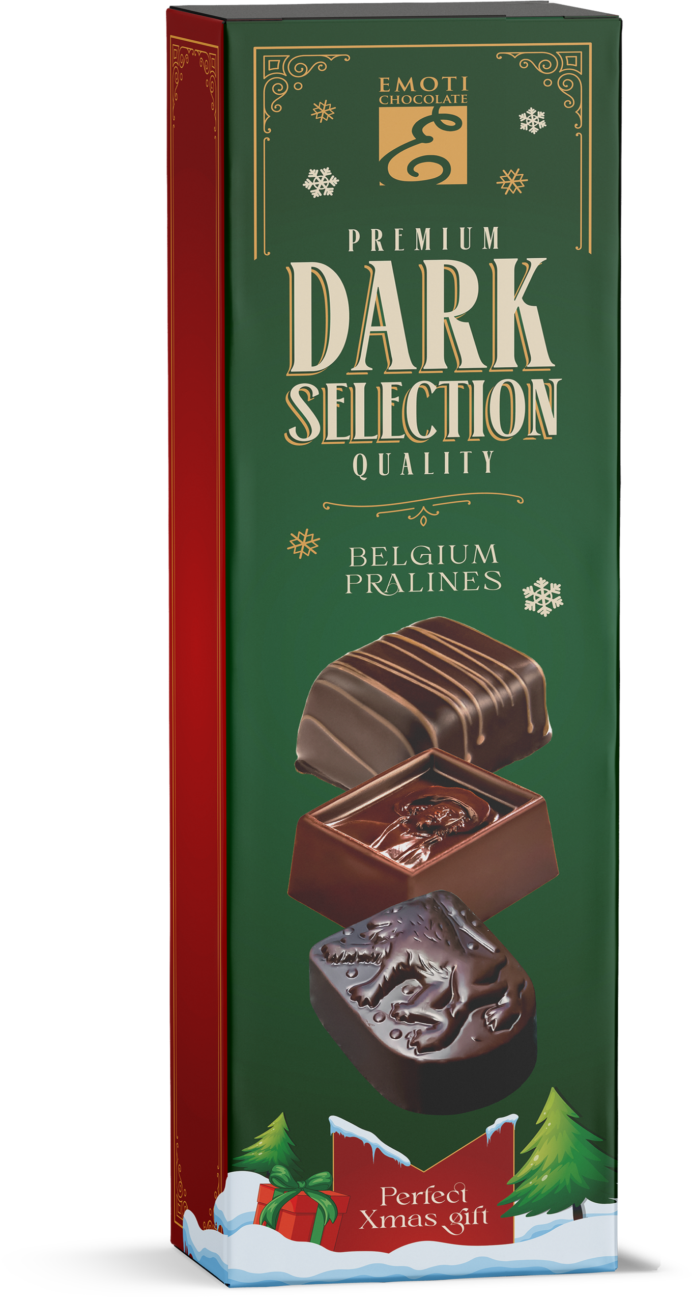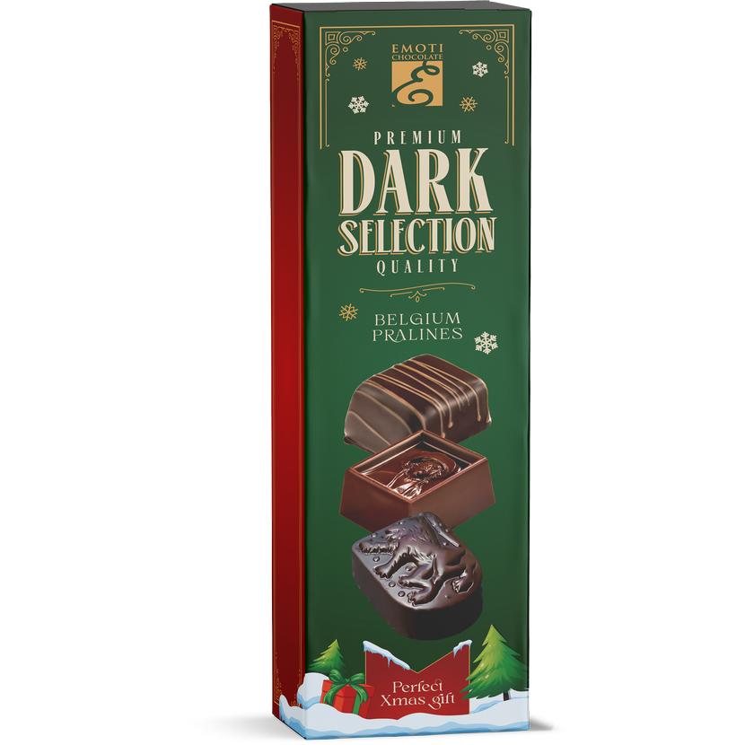 Elegantní vánoční balení plné jemných belgických pralinek z kvalitní hořké čokolády. Prémiová kolekce Dark Selection od značky Emoti přináší výjimečný chuťový zážitek pro všechny milovníky výraznějších a méně sladkých čokolád. Každá pralinka je precizně vyrobena dle tradiční belgické receptury a ukryta v reprezentativním balení, které se skvěle hodí jako dárek pod stromeček, pro kolegy nebo obchodní partnery.