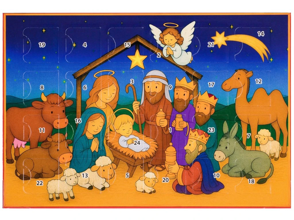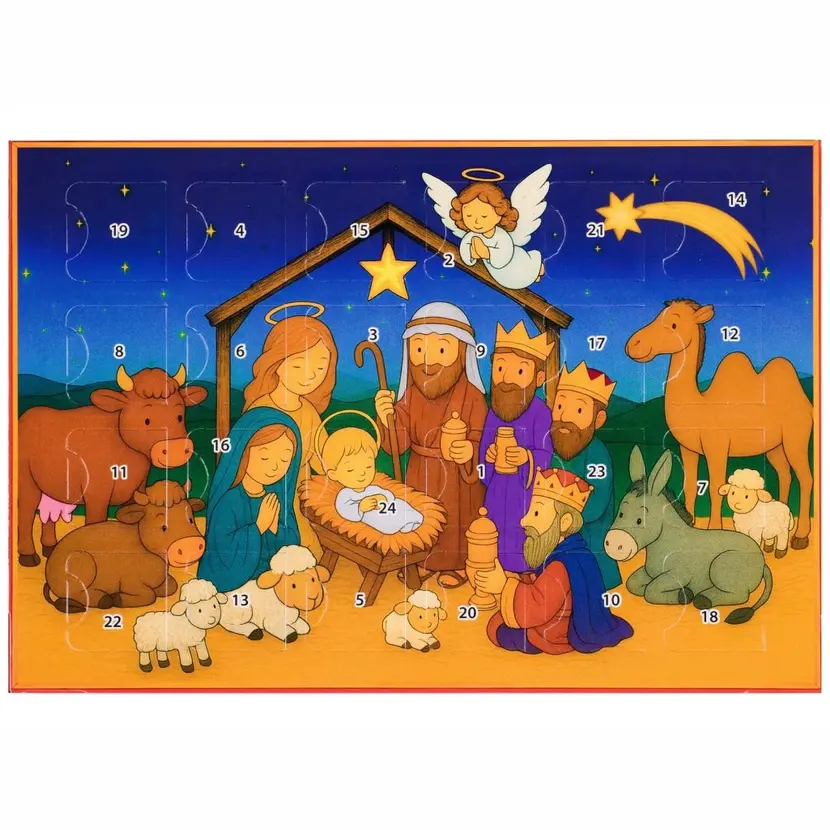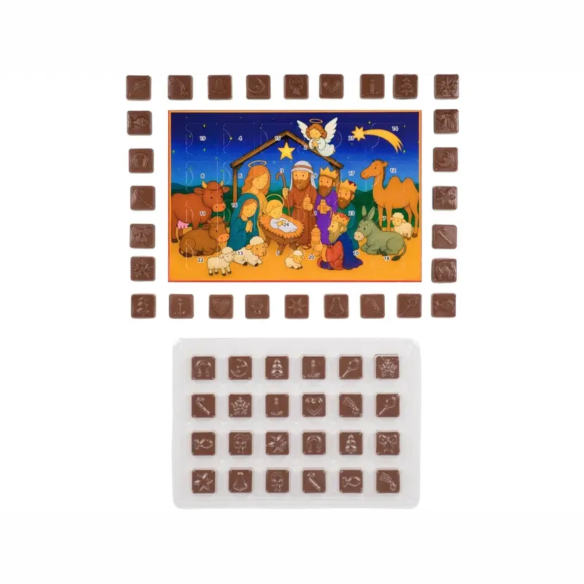 Tradiční adventní kalendář s motivem Betléma od českého výrobce Fikar přináší kouzelnou vánoční atmosféru přímo do vašeho domova. Za 24 okénky se skrývají kousky jemné mléčné čokolády, které dětem každý den zpříjemní čekání na Štědrý den. Formát A5 je ideální pro děti – praktický, skladný a snadno přenosný. Motiv betlémské krajiny s postavičkami svaté rodiny osloví všechny, kdo mají rádi klasické vánoční hodnoty.