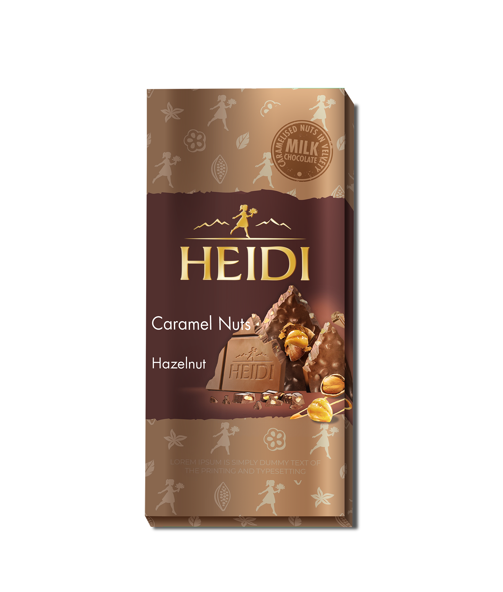 Mléčná čokoláda sypaná praženými karamelizovanými oříšky. Užijte si chuť a vůni karamelu, oříšků a lahodné čokolády v této tabulce.V této kolekci Heidi Caramel Nuts nabízíme ještě příchuť mandle nebo pistácie