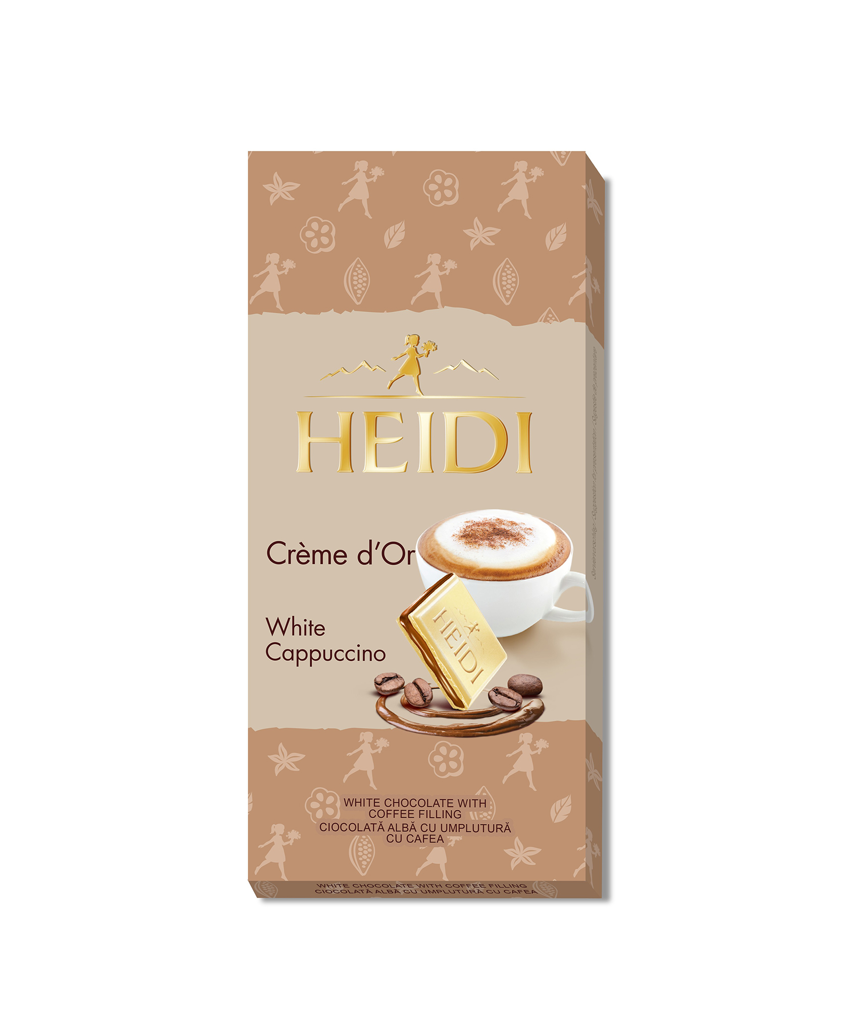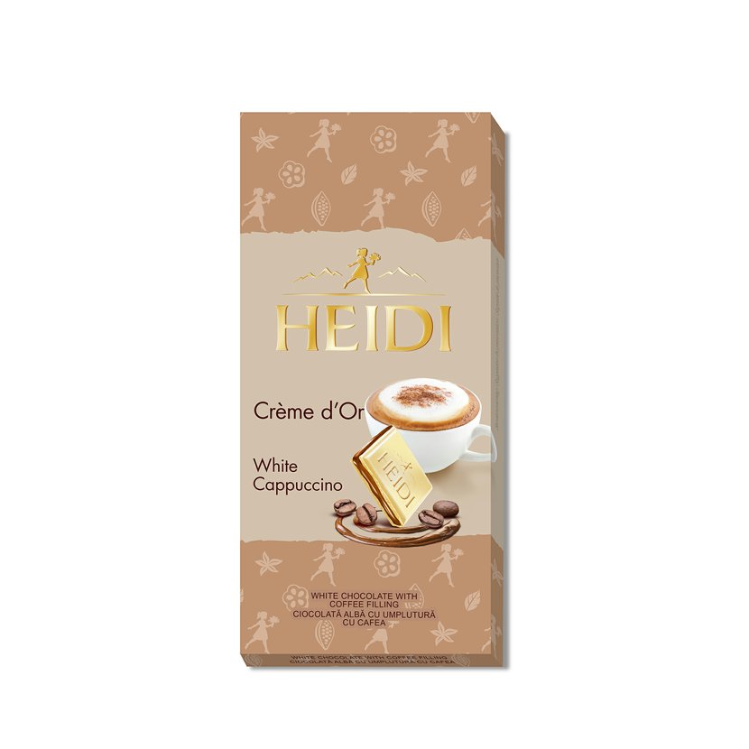 Vydejte se na cestu lahodného potěšení s čokoládou Heidi Cremé D’Or Cappuccino – harmonickým spojením jemné bílé čokolády a bohaté krémové náplně s příchutí cappuccina. Tato delikatesa potěší každého milovníka sladkostí, kteří ocení vytříbenou kombinaci sladké smetanové chuti s dotekem kávy. Díky pečlivě vybraným surovinám a preciznímu zpracování nabízí každé sousto dokonalou rovnováhu mezi jemností a intenzitou. Skvělá jako malý luxusní dárek nebo jako osobní požitkářský moment.