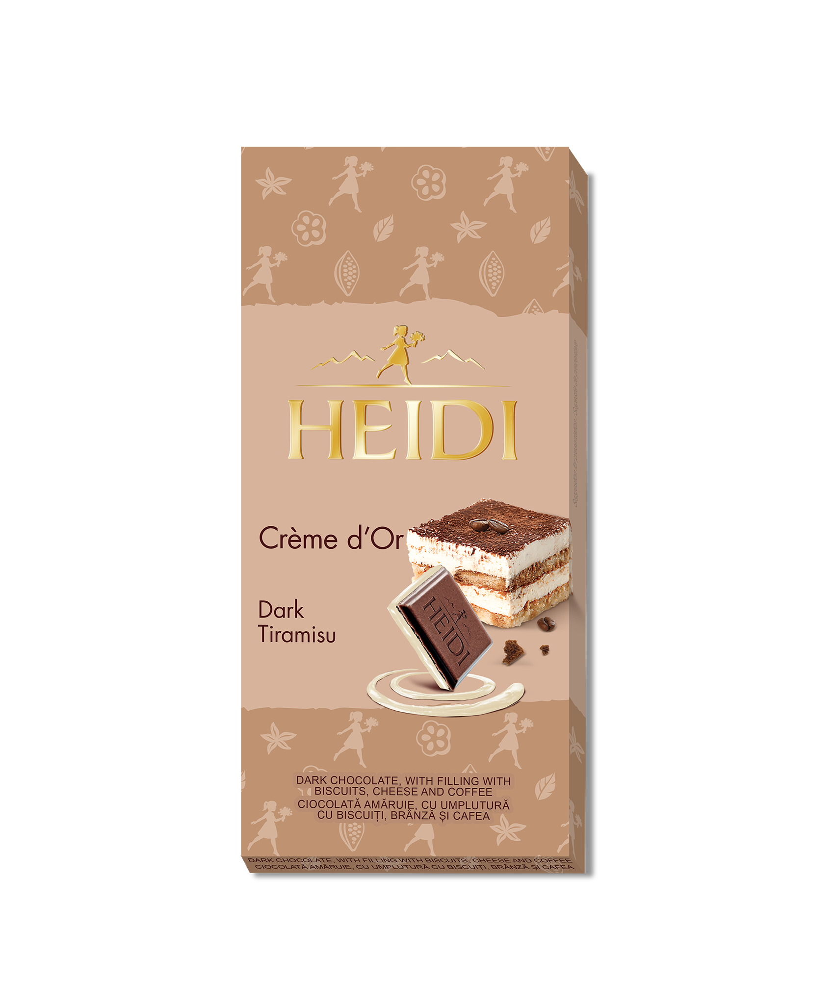 Zažijte neodolatelný chuťový zážitek s čokoládou Heidi Créme D’Or Tiramisu – vytříbenou kombinací jemné hořké čokolády a bohaté krémové náplně s tóny kávy a sušenek, inspirované tradičním italským dezertem tiramisu. Tato prémiová čokoláda přináší dokonalou rovnováhu mezi výraznou chutí kvalitního kakaa a sladce krémovým středem s kávovou notou. Je ideální volbou pro všechny, kteří hledají sladkost s nádechem elegance a sofistikovanosti.