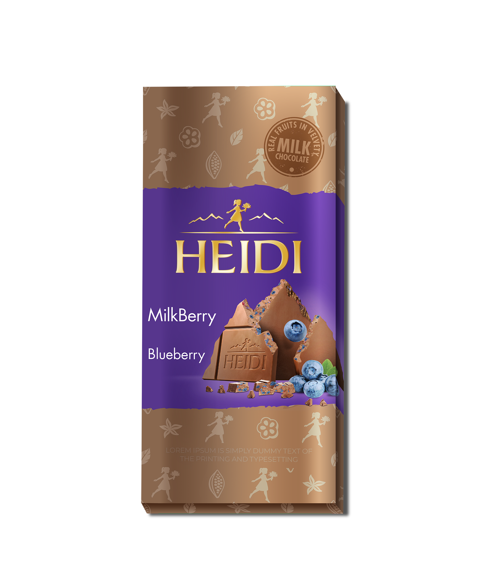 Dopřejte si výjimečný zážitek s čokoládou Heidi MilkBerry Blueberry! Tato tabulka představuje dokonalou harmonii jemné mléčné čokolády a kousků pravých borůvek, které jsou (jak napovídá slogan na obalu) skryté jako "skutečné ovoce v sametu mléčné čokolády" (REAL FRUITS IN VELVET MILK CHOCOLATE).