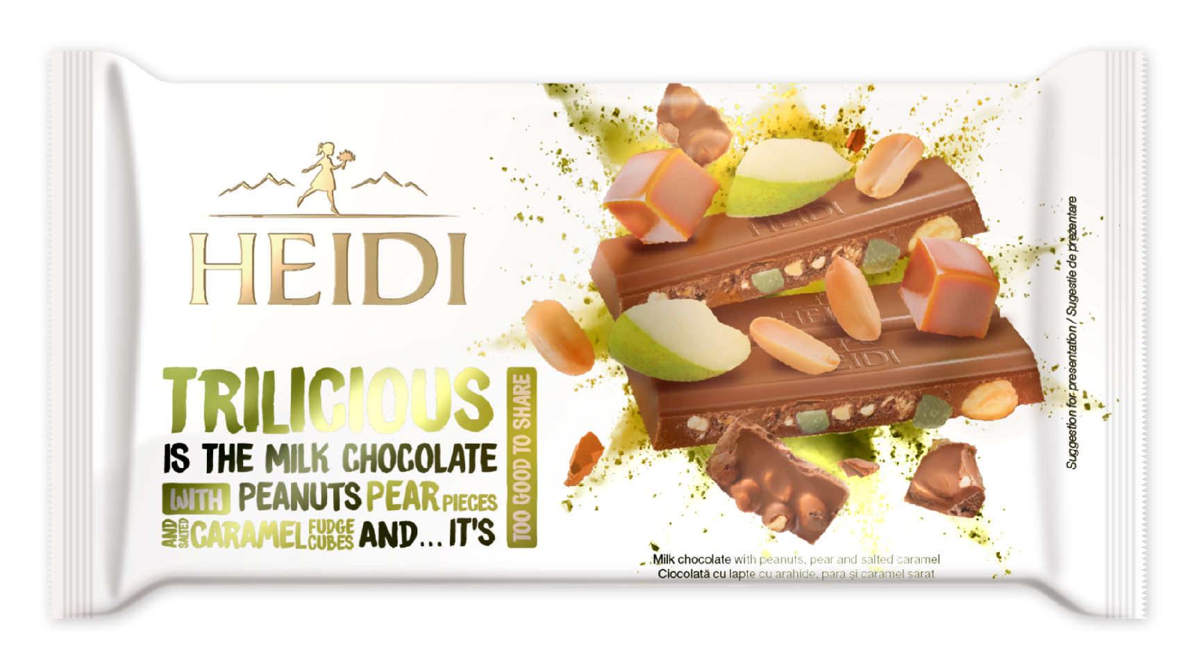 Hledáte mléčnou čokoládu plnou ovoce a oříšků? Šáhněte po této nové Heidi. Kvalitní mléčná čokoláda obsahuje kousky šťavnaté hrušky, arašídy a kousky slanného karamelu. Tuto čokoládu můžete dát jako dárek, pokud ji tedy dřív nesníte.