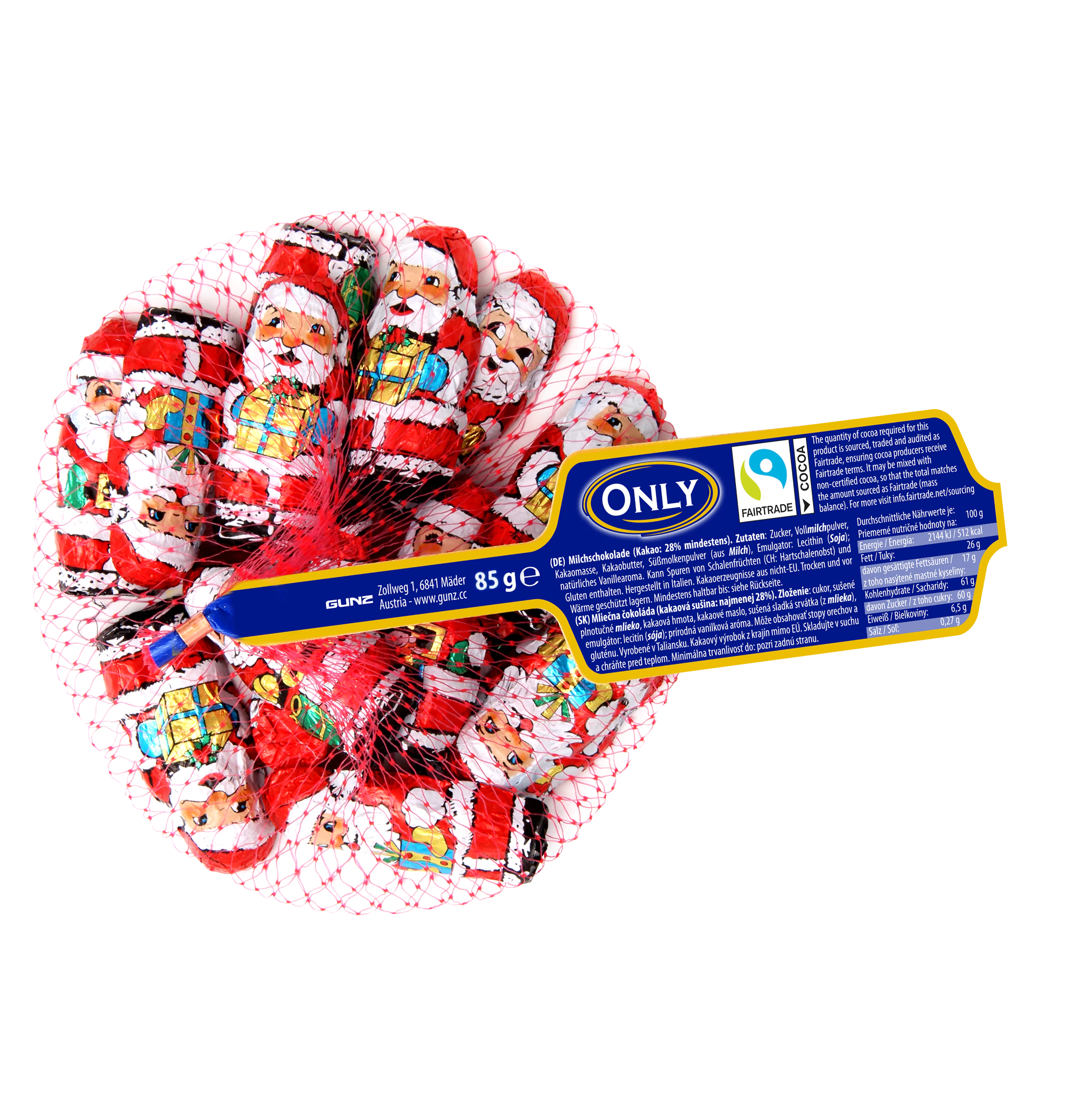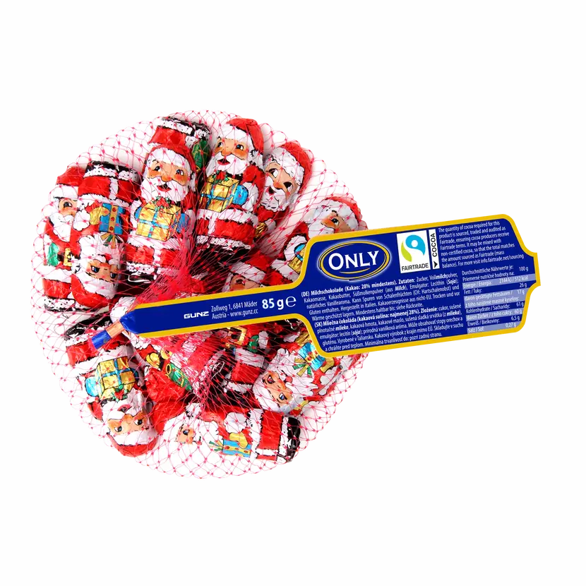 Přineste si kouzlo Vánoc s těmito roztomilými figurkami Santa Clause z jemné mléčné čokolády! Každá figurka je vyrobena z kvalitní mléčné čokolády a plněná lahodnou mléčnou náplní, která potěší malé i velké mlsouny. Balení obsahuje mix malých santíků v barevném alobalu, ideální jako sladká odměna pro děti, dekorace na stromeček nebo jako drobný dárek pro radost. Výrobek je Fairtrade certifikovaný, což zaručuje podporu spravedlivého obchodu a udržitelné výroby kakaa.