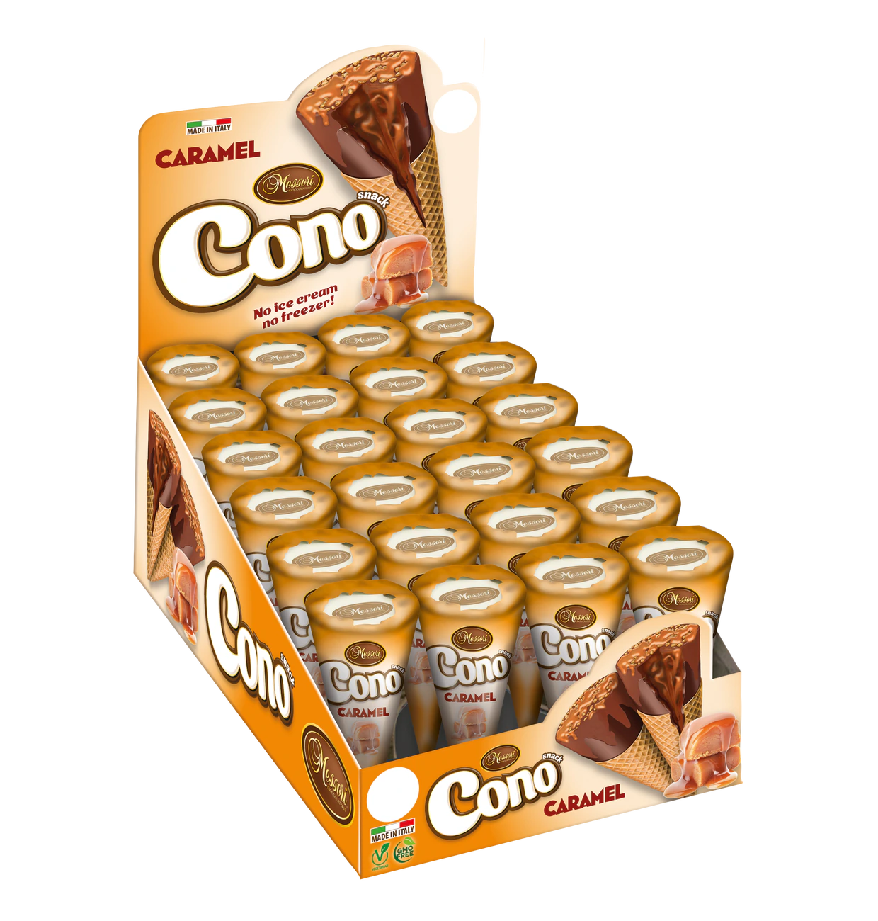 Lahodný kornoutek Messori Cono Caramel je ideální sladká svačina pro každou chvíli. Křupavý oplatkový kornout je naplněn jemným karamelovým krémem a zakončen bohatou vrstvou čokolády s karamelovou polevou. Vypadá jako zmrzlina, ale nevyžaduje mražení – můžete si ho vychutnat kdykoliv a kdekoliv. Vyrobeno v Itálii z kvalitních surovin, tento snack potěší děti i dospělé a skvěle se hodí do školy, do práce, na cesty nebo jako sladká tečka po jídle.