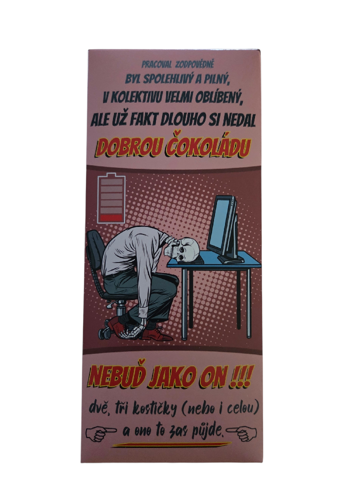 Originální mléčná čokoláda s vtipným motivem pro všechny workoholiky, unavené kolegy i ty, kteří si už „fakt dlouho nedali dobrou čokoládu“. Stylová ilustrace vyčerpaného hrdiny u počítače a trefný text z ní dělají ideální dárek do kanceláře, pro šéfa, kolegu nebo kamaráda, který potřebuje dodat energii – a hlavně úsměv.
