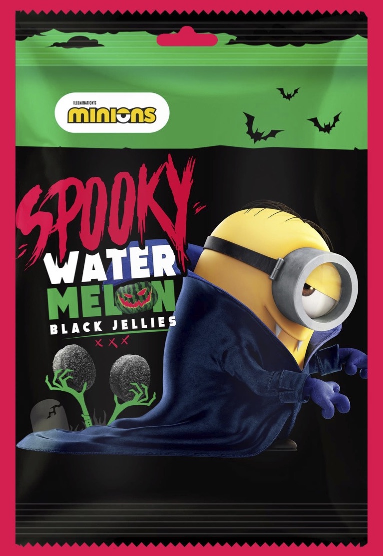 Připravte se na děsivě dobrý zážitek s bonbóny Spooky Watermelon by Minions! Tyto černé želé bonbóny s osvěžující příchutí vodního melounu vás překvapí nejen svou intenzivní chutí, ale i zábavným halloweenským designem s oblíbenými Mimoňi. Ideální sladkost na strašidelnou párty nebo jako originální pochoutka pro děti i dospělé. Balení je tematicky laděno do Halloweenu – s upírským Mimoni, netopýry a strašidelnými melounovými příšerkami. Skvělý dárek, výzdoba nebo sladká odměna pro malé koledníky!