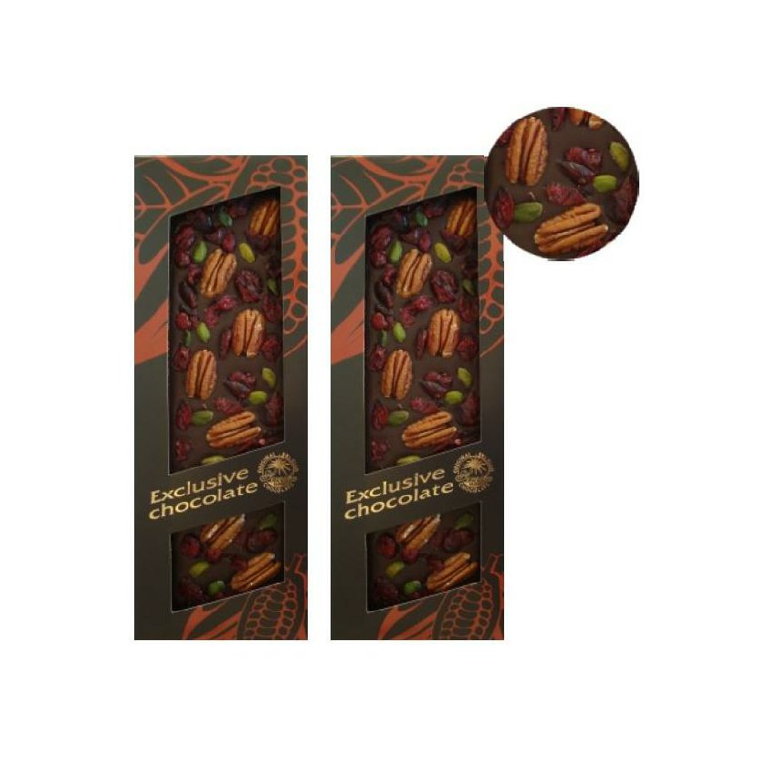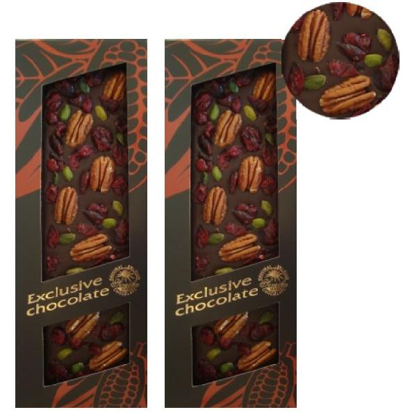 Čokoláda byla vyrobená v Belgii. Tvoří krásnou barevnou dekoraci díky červeným brusinkám, zeleným pistáciím a hnědým pekanovým ořechů.