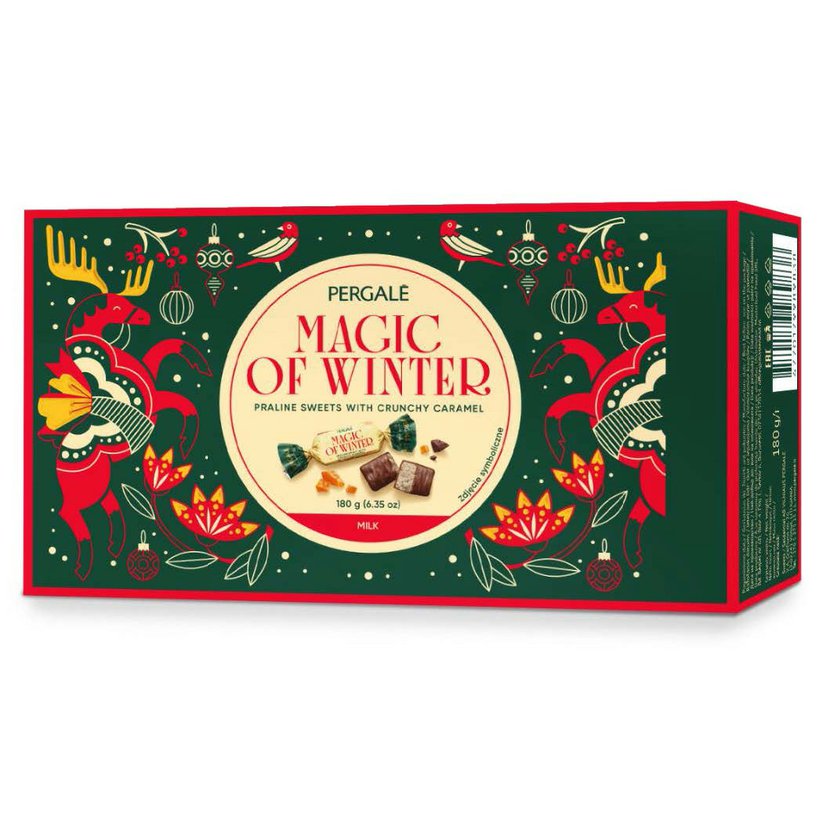 Vánoční bonboniéra obsahuje pralinky z mléčné čokolády s křupavým karamelem. Karamelové pralinky budou příjemnou vánoční pozorností. Díky elegantním barevném designu se hodí také do dárkového balíčku