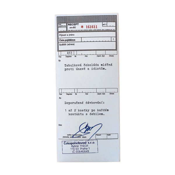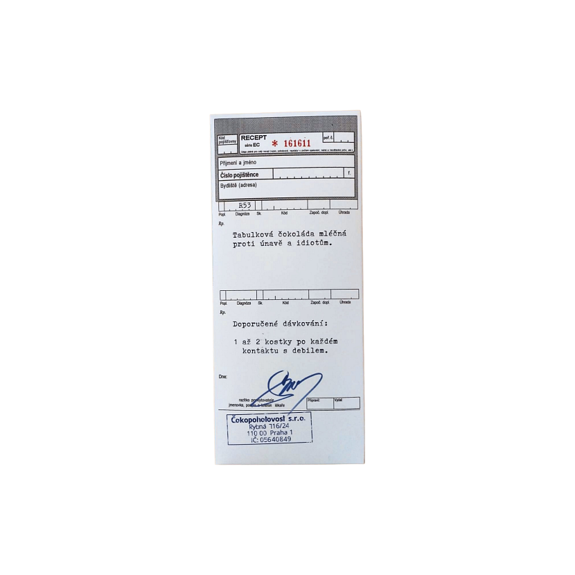 Máte za sebou náročný den plný nesmyslů? Potřebujete si spravit náladu po kontaktu s lidskou stupiditou? Máme pro vás předepsané to nejlepší – čokoládový recept od Jamiry! Tato čokoláda není jen tak ledajaká – je zabalena ve formě lékařského receptu a doporučuje se užívat 1 až 2 kostky po každém kontaktu s "de... ehm... výzvami života".