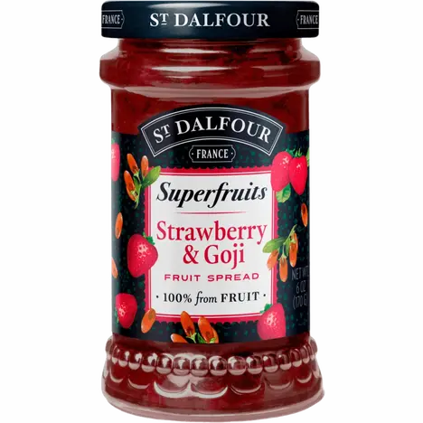 Ochutnejte dokonale vyváženou kombinaci sladkých jahod a exotických plodů goji v pomazánce St. Dalfour. Vyrobená podle tradiční francouzské receptury, bez přidaného cukru, konzervantů, barviv či umělých aromat. Přirozeně sladká díky koncentrované ovocné šťávě, vhodná pro ty, kdo hledají zdravější alternativu. Jahodová pomazánka bude skvělá na čerstvé pečivo, palačinky, do jogurtu.