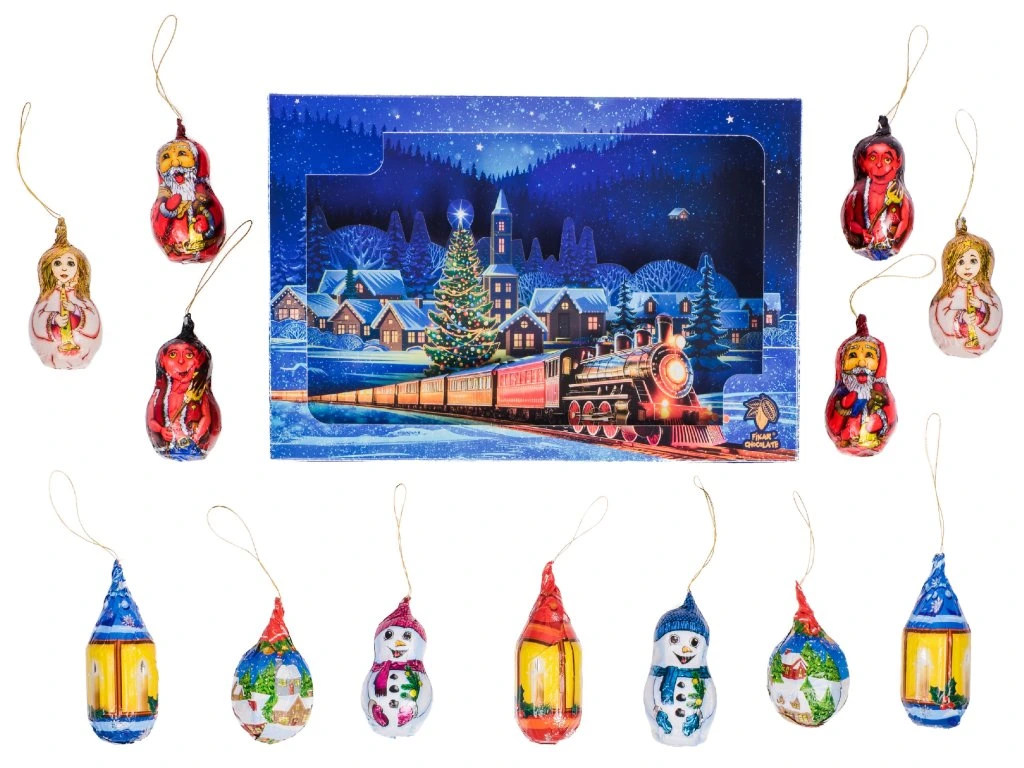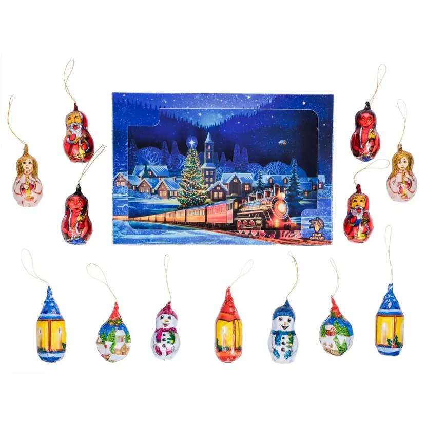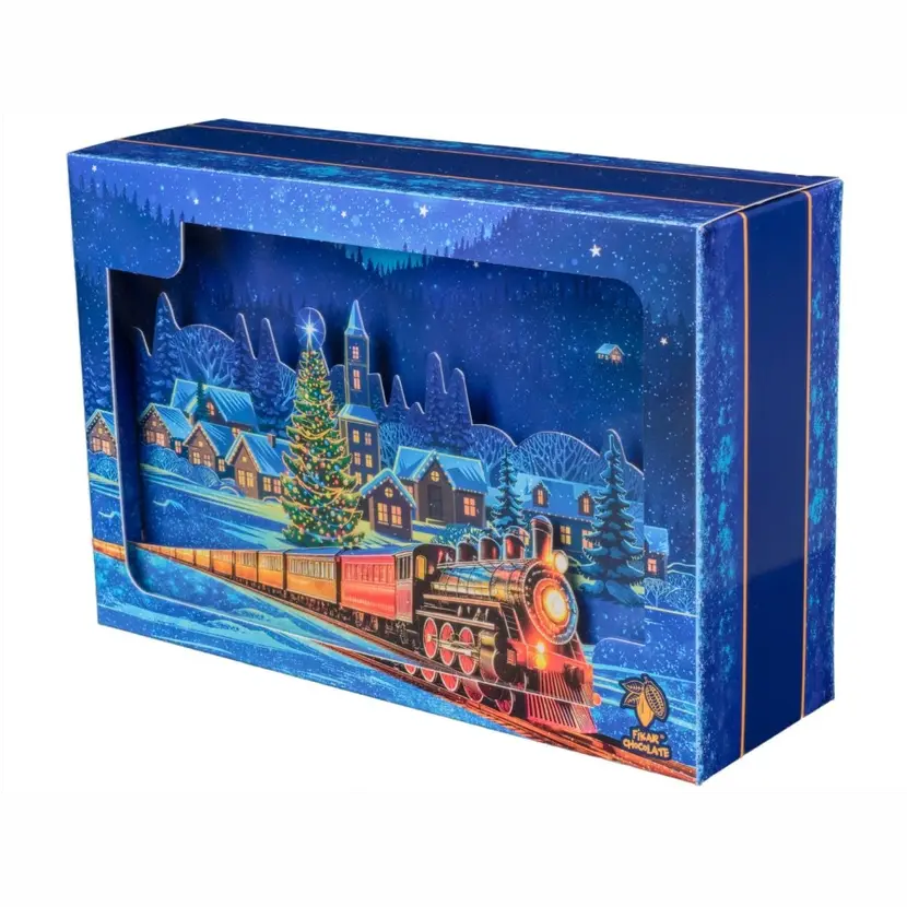 Ponořte se do kouzla Vánoc s naší vánoční kolekcí čokoládových ozdob od tradičního výrobce Fikar. Tato exkluzivní kolekce, vyrobená z pravé belgické čokolády, je balena v jedinečné 3D krabičce typu leporelo s nádherným motivem nočního vlaku projíždějícího zasněženou krajinou. Uvnitř balení najdete 200g čokoládových ozdob v různých, hravých tvarech, jako jsou matrjošky, sněhuláci a vánoční lucerny. Každá ozdoba je opatřena stuhou pro snadné zavěšení, a tak se z ní stane nejen lahodná sladkost, ale i krásná jedlá dekorace na váš vánoční stromeček.