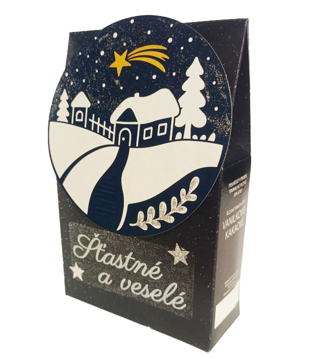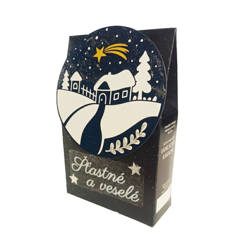 ✅ Hmotnost: 55 g ✅ Typ: Lázeňské oplatky ✅ Vánoční motiv: Chaloupka s kometou ✅ Text na obalu: „Šťastných a veselých Vánoc“ ✅ Vhodné jako: Drobnost k dárku, pozornost pro kolegy, vánoční pohoštění