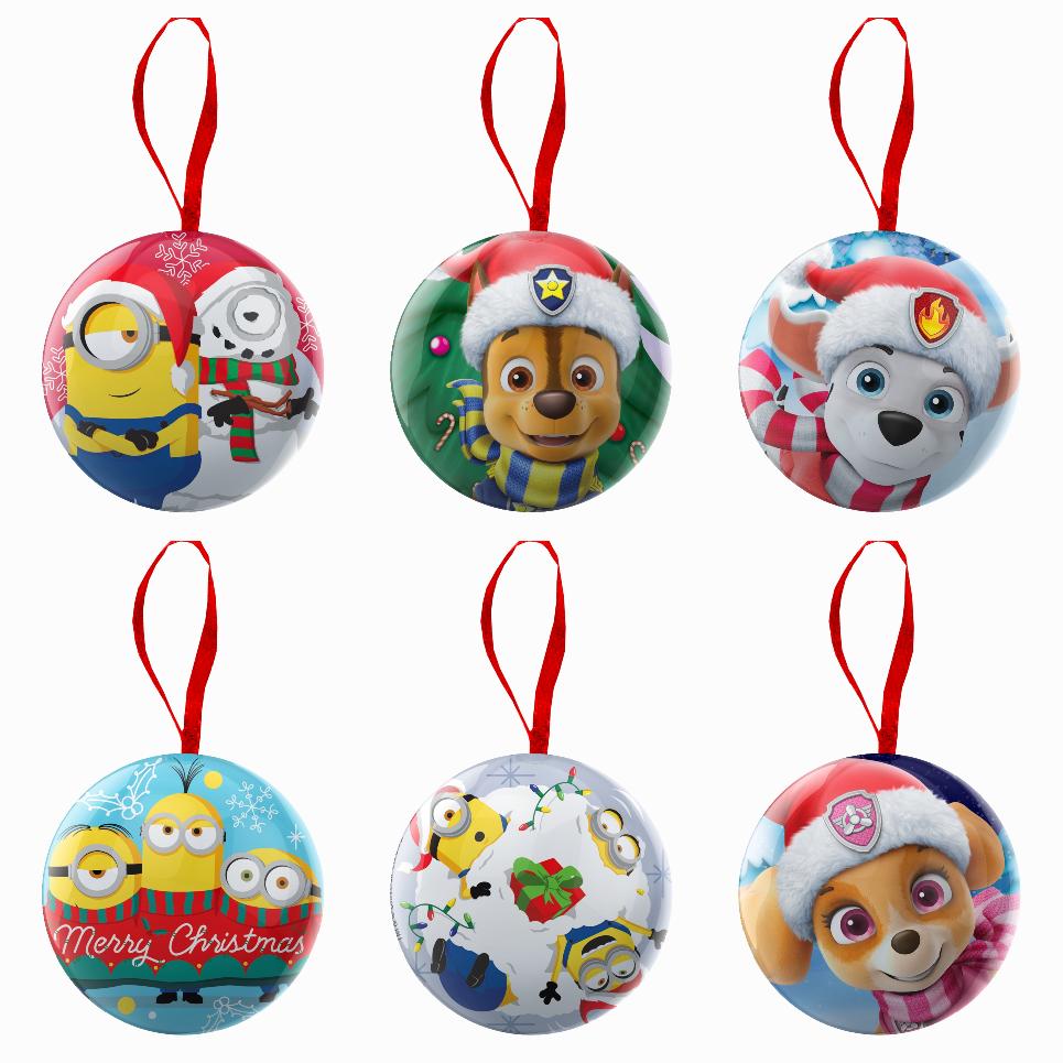 Vneste do vánoční výzdoby radost a hravost s těmito roztomilými plechovými závěsnými koulemi s motivy Paw Patrol a Mimoňů. Každá koule ukrývá lahodnou sušenku s kousky čokolády, která potěší malé mlsouny i jejich rodiče. Koule lze zavěsit na stromeček nebo využít jako originální dárek či mikulášskou nadílku.