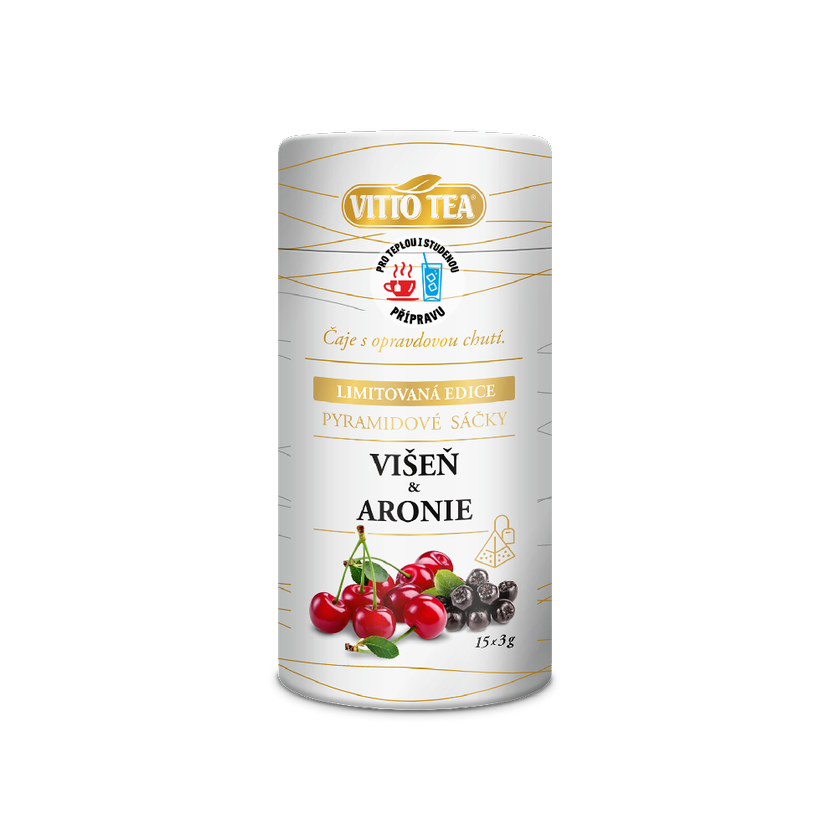Limitovaná edice ovocného čaje s intenzivní chutí višní a aronie v praktických pyramidových sáčcích.