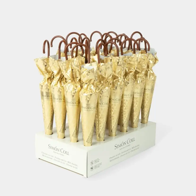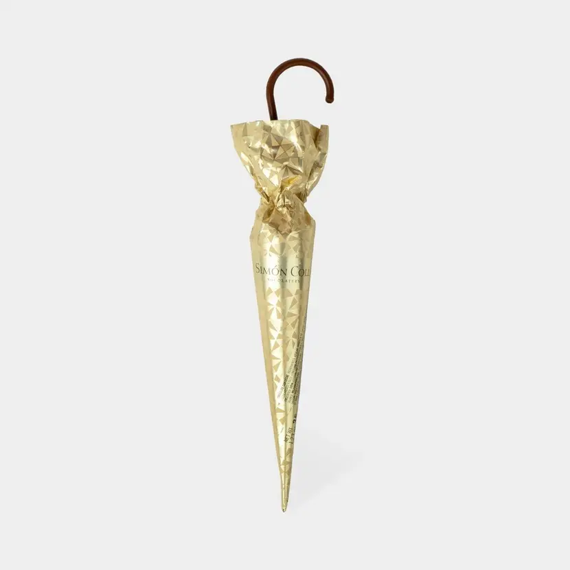 Elegantní deštníky z mléčné čokolády ve zlaté barvě. Deštníky využijete k dárkům, jako dekoraci či jako sladkou pozornost nejen o vánocích